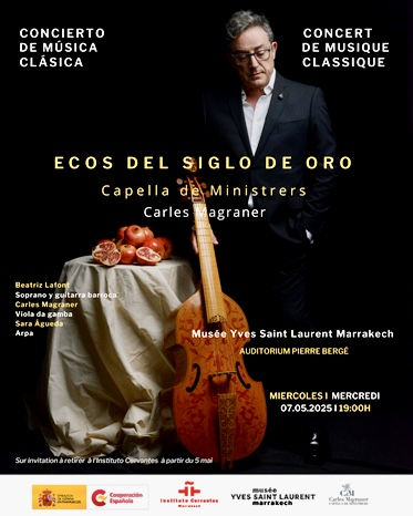 L’Ambassade d’Espagne au Maroc et l’Institut Cervantes de Marrakech, en partenariat avec le Musée Yves Saint Laurent de Marrakech, présentent le concert Echos du Siècle d’Or, un hommage musical à Miguel de Cervantes interprété par l’ensemble espagnol Capella de Ministrers, sous la direction de Carles Magraner.