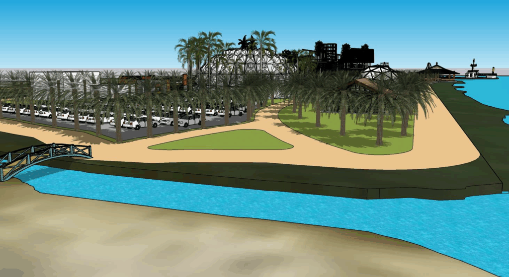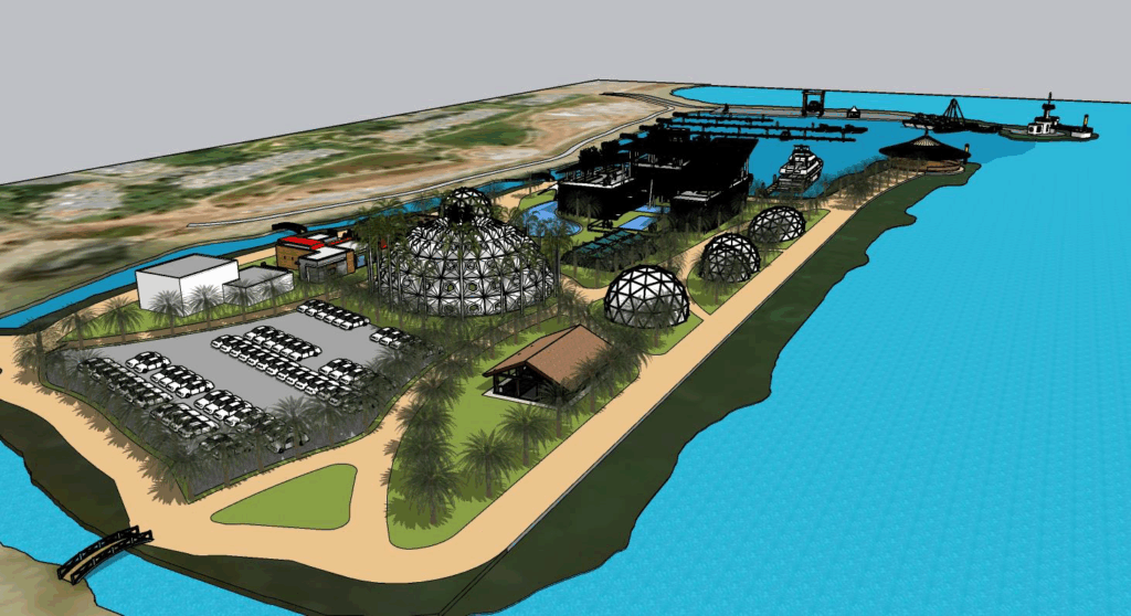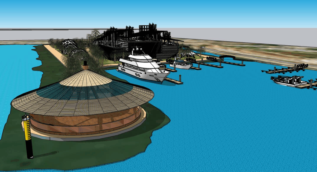 -L’aménagement d’espaces terrestres comprenant un hôtel 5 étoiles, un centre commercial, des restaurants, un gymnase, un parc d’enfants, des ateliers de réparation et un parking dédié.