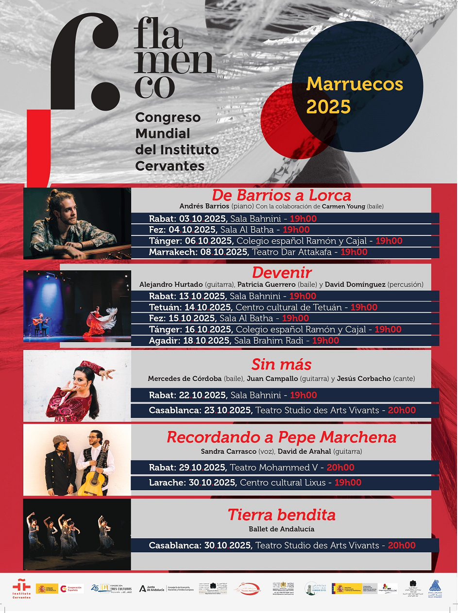 Pour la quatrième année consécutive, l’Ambassade d’Espagne au Maroc et l’Institut Cervantes organisent le Congrès Mondial du Flamenco, qui présentera quatorze spectacles de haut niveau dans huit villes du Royaume du Maroc. Il s’agit d’un engagement en faveur de la diffusion de cet art à travers une programmation internationale, fondée sur la collaboration habituelle de l’Institut Cervantes avec les festivals les plus prestigieux du monde et dans des salles d’exposition sur les cinq continents.
