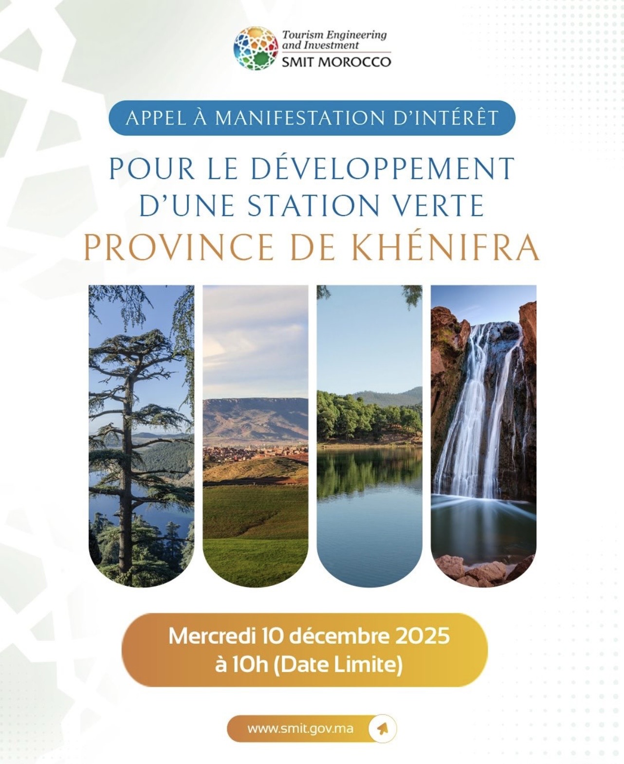 La Société Marocaine d’Ingénierie Touristique a officiellement lancé un Appel à Manifestation d’Intérêt visant à sélectionner un projet de « Station verte » situé dans la province de Khénifra. L’initiative, inscrite dans la feuille de route nationale 2023–2026, a pour objectif la création d’un établissement d’hébergement touristique classé en milieu rural, soit un gîte, une ferme d’hôtes, un camping, un hôtel-club ou  un hébergement alternatif, qui proposera des activités de pleine nature, randonnée, vélo, pêche, équitation, canoë, etc. Les dossiers devant être remis sur la plateforme SMIT avant le 10 décembre 2025 à 10h.