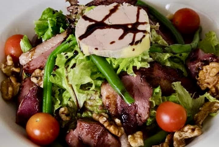 -Plat végétal : Mille-feuille de légumes grillés, crème de pois chiche et vinaigrette au cumin. Une alternative construite et savoureuse, conçue pour satisfaire autant les végétariens que les amateurs de plats structurés.