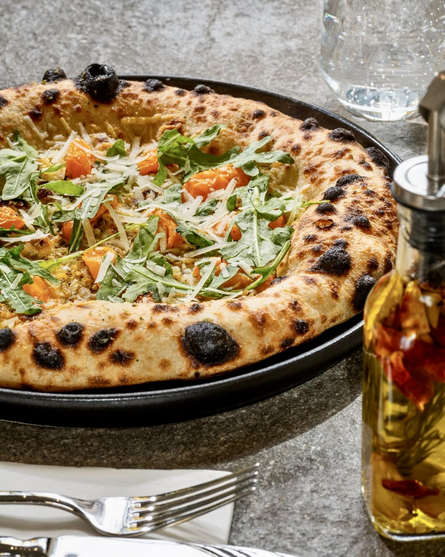 -Pizza artisanale : Pâte levée 48 h, base tomate San Marzano, mozzarella di bufala, za’atar et huile d’olive. Croustillante sur le pourtour, moelleuse au cœur.