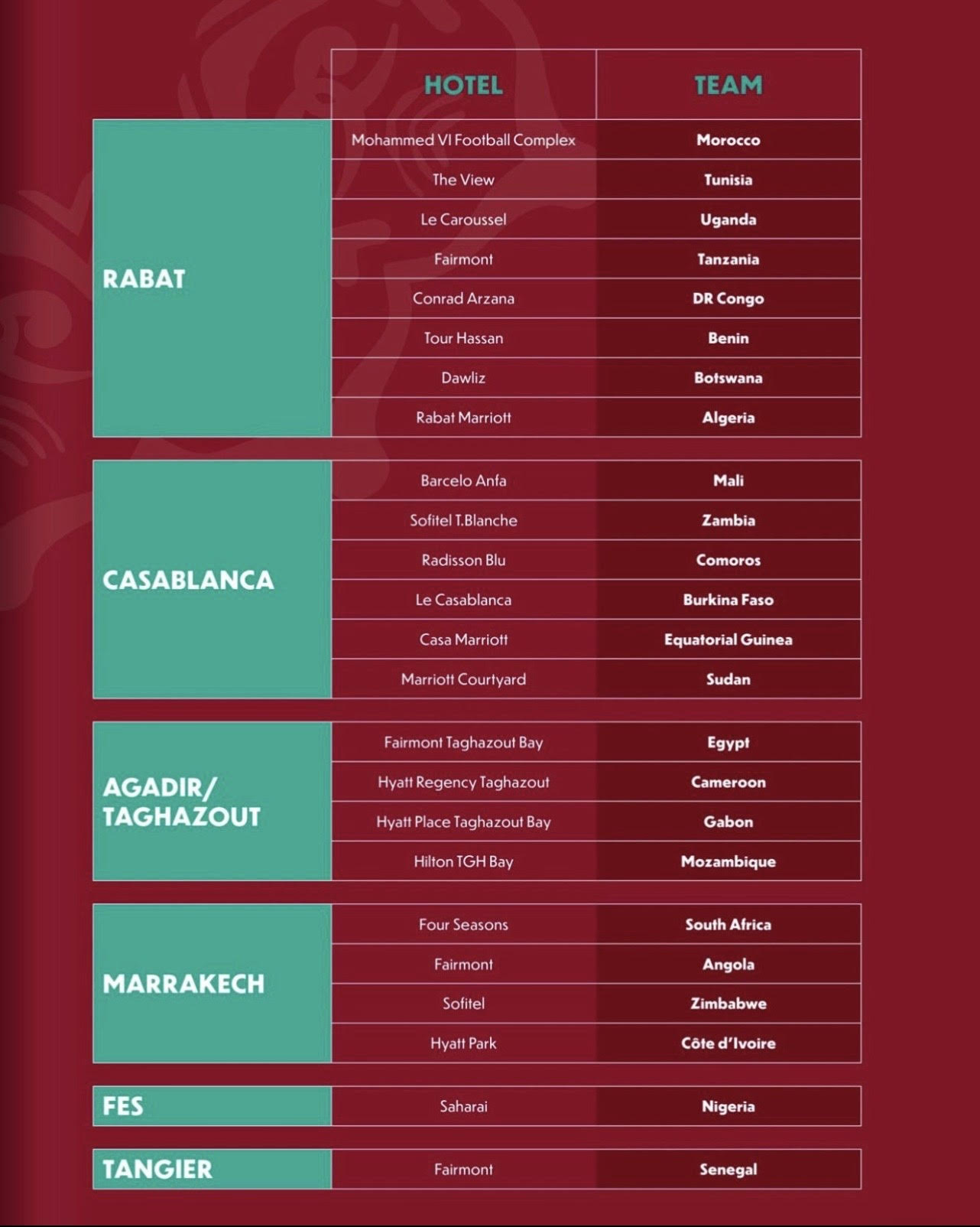 La liste a officiellement été arrêtée des hôtels qui serviront de quartiers généraux aux sélections qualifiées. Répartis sur plusieurs villes du Royaume, Rabat, Casablanca, Agadir/Taghazout, Marrakech, Fez et Tanger. Les établissements ont été sélectionnés selon des critères rigoureux alliant sécurité, logistique, proximité des sites d’entraînement, qualité hôtelière et capacité d’isolement sportif.