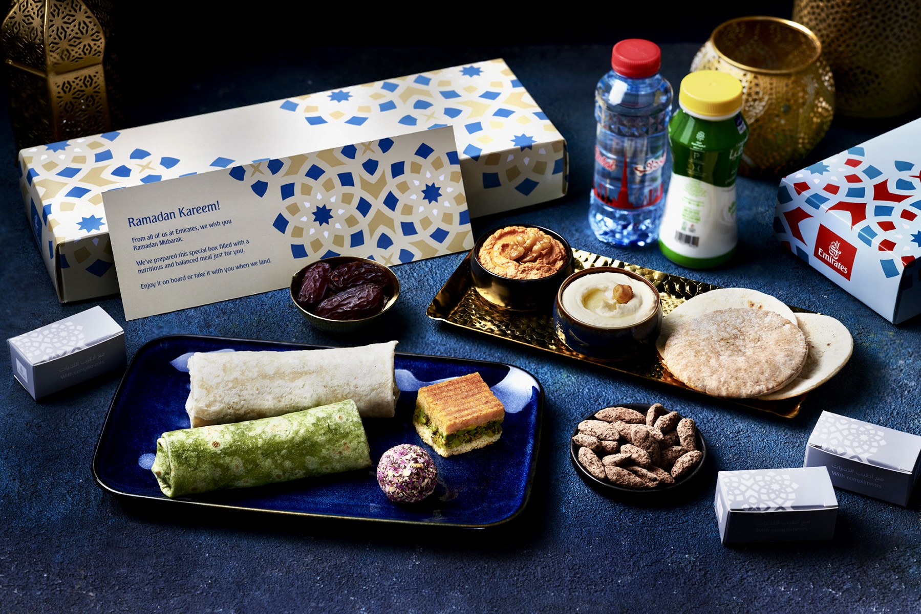 Dans toutes les classes de voyage vers certaines destinations, les passagers jeûnant recevront en complément du service habituel de repas chauds une boîte Ramadan au design inspiré de l’art géométrique islamique. Les menus incluent dattes, mezzés légers (houmous, moutabel, mouhammara), sandwichs au poulet mossakan ou aux herbes, douceurs traditionnelles (maamouls, baklawas, amandes enrobées) et laban.
