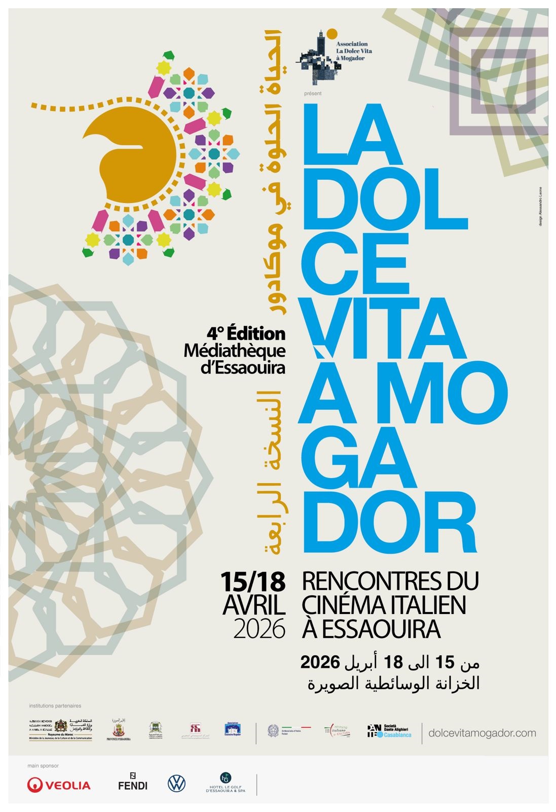 Sous les alizés, la magie du septième art opère à nouveau. L’Association Dolce Vita à Mogador a l’immense honneur d’annoncer officiellement la quatrième édition de « La Dolce Vita à Mogador », qui se tiendra du 15 au 18 avril 2026 à Essaouira. Dans un cadre enchanteur, cet événement célèbre la créativité et l’excellence du cinéma italien, confirmant, édition après édition, son rôle majeur dans le dialogue culturel entre l’Italie et le Maroc. Portée par l’engouement du public et par le succès des éditions précédentes, cette nouvelle édition poursuit son essor et renforce l’image du festival comme un rendez-vous incontournable du cinéma italien et un pont culturel méditerranéen.