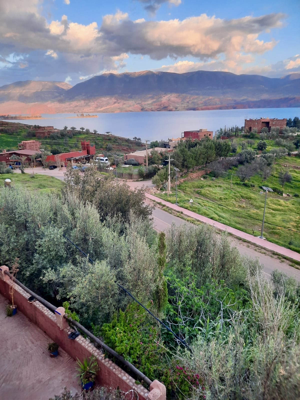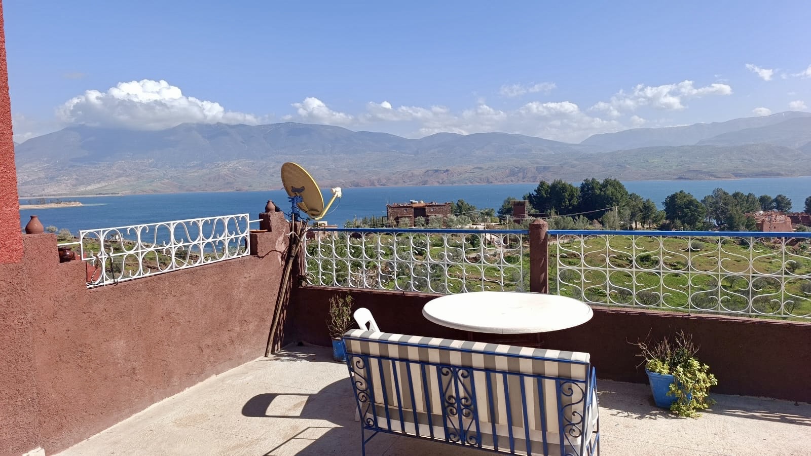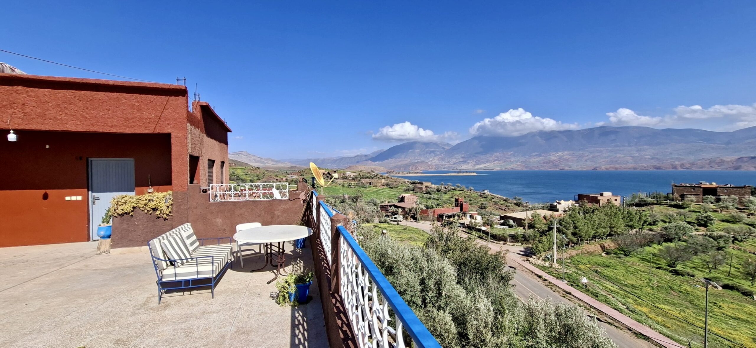 Le lac de Bin El Ouidane s’étire en contrebas dans une ampleur presque irréelle. Depuis la chambre, depuis la terrasse principale, depuis le toit-terrasse encore plus spectaculaire, le regard ne rencontre aucun obstacle. Seulement l’eau, les collines, les lignes brunes et vertes des reliefs, les barques minuscules, et cette lumière si particulière du Haut Atlas qui change le paysage d’heure en heure.