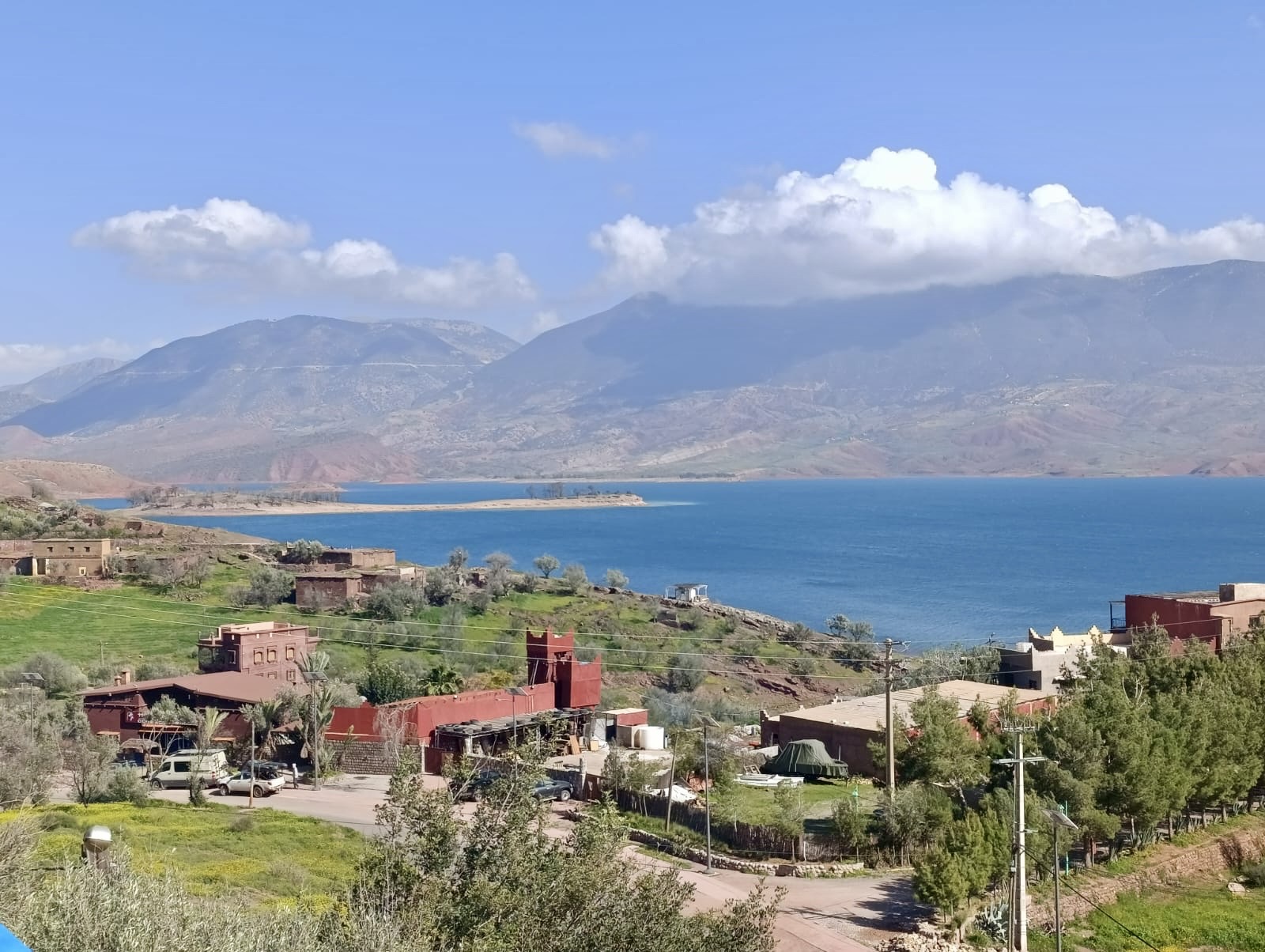 Le lac de Bin El Ouidane s’étire en contrebas dans une ampleur presque irréelle. Depuis la chambre, depuis la terrasse principale, depuis le toit-terrasse encore plus spectaculaire, le regard ne rencontre aucun obstacle. Seulement l’eau, les collines, les lignes brunes et vertes des reliefs, les barques minuscules, et cette lumière si particulière du Haut Atlas qui change le paysage d’heure en heure.