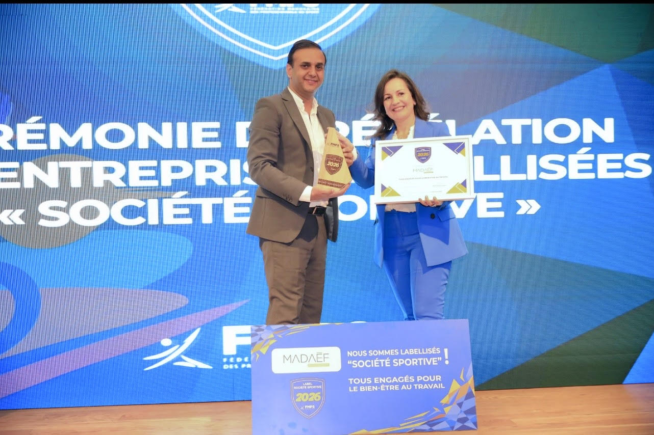 Madaëf Management a récemment obtenu le label « Société Sportive » 2026. Décernée par Fédération Marocaine des Professionnels du Sport, cette distinction est certainement méritoire, consacrant ce label qui a été créé en 2024 par la commission « Sport en entreprise » de la FMPS, ayant pour objectif de distinguer les sociétés qui intègrent concrètement l’activité physique dans leur culture interne, comme les événements sportifs, le financement d’abonnements, l’aménagement d’horaires, les infrastructures, les campagnes de sensibilisation ou le soutien à des collaborateurs engagés dans une pratique régulière.