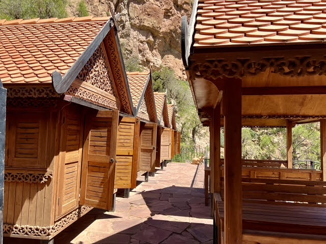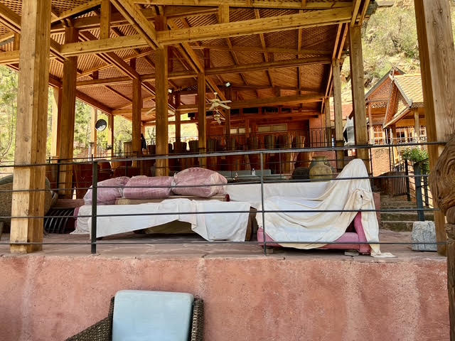 Il ne s’agit pas d’un restaurant au sens classique, mais d’une mise en scène gorgée d’art. Une architecture légère, temporaire ou semi-permanente, parfaitement intégrée au paysage, entièrement électrifiée avec ascenseur panoramique, réalisée dans une logique de confort discret. De larges terrasses en bois local agrémentent l’espace, meublées avec une sobriété assumée, enrichies par des pièces d’artisanat soigneusement sélectionnées. Rien d’ostentatoire, tout est calibré. L’ensemble évoque davantage un refuge confidentiel qu’un établissement commercial.